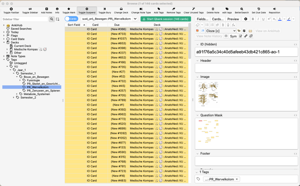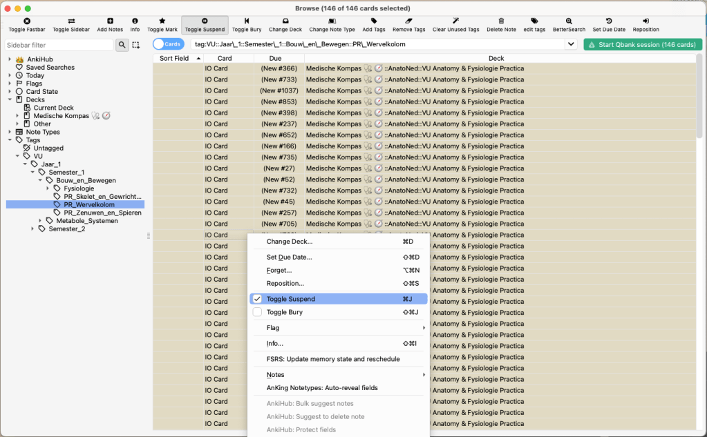 Alle kaarten/rijen zouden nu geel gekleurd moeten zijn, zoals hierboven (als ze niet geel zijn dan “toggle suspend” weer. Dit betekent dat ze niet beschikbaar zijn om te studeren totdat je een kaart weer activeert.