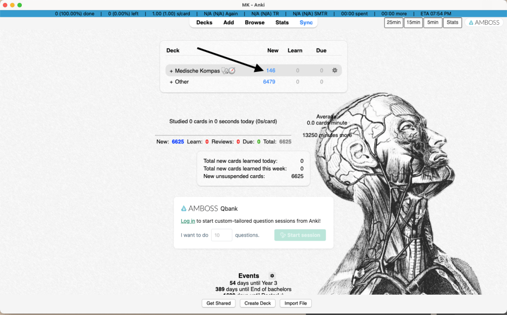 [Tijd 15-25 mins] Naar het openen van Anki (als je nog niet hebt geïnstalleerd, klik dan hier voor de handleiding) zie je het hoofdscherm van het Medisch Kompas Deck (zwarte pijl), hier worden alle kaarten opgeslagen die voor die dag gepland staan.