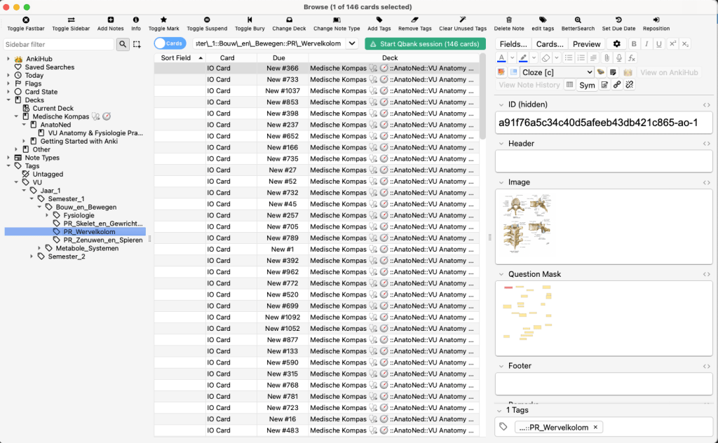 Selecteer vervolgens in de tags-sectie aan de linkerkant het praktische onderdeel dat je wilt studeren, bijvoorbeeld: AnatoNed -> Instelling -> VU -> Jaar_1 -> Semester_1 -> Bouw_en_bewegen -> PR_Wervelkolom, zoals hieronder weergegeven.