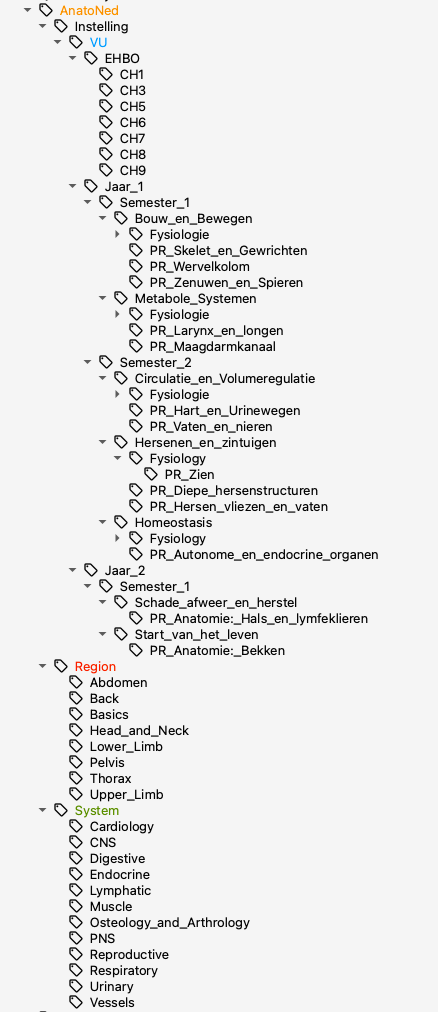 29/09/24 Update – Het tag-organisatiesysteem is enigszins gewijzigd om meer hiërarchisch te zijn en om per universiteit te organiseren, region en system. Hieronder ziet het er zo uit. De hoofdtag is nu AnatoNed